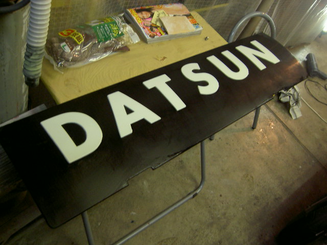 今回のお仕事はリアゲートにDATSUNの文字が浮き文字になっているパネルをペイント!!文字はぱっと見白なんだけどなんとなくシルバーぽい感じ、、、、、難しい事をおっしゃいます!!