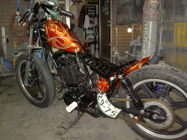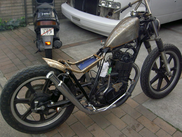 PICT2688.JPG今日はSRにマフラーを溶接して、タンクの加工を終わらせ、、、、、ちょっとずつだが出来てきました!!マフラーステーや、ライトステーなど地味な部分ですが加工は結構時間がかかる、、、、、疲れた~、、最近怪我が多くていやになっちゃいます、、あちこち痛い、あ!そうそう!!後ろにちらっと映っているアストロは仕事用に仕入れてきた僕のです!!