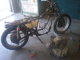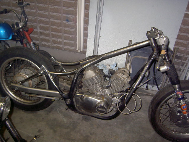 PICT2133.JPGSRVのフレームがほぼできました!!F周りはキックバックさんに譲っていただいたSR400のものです!!ポン付けでいけるかなーと思ったのですがステム長が足りずシャフトの入れ替えが必要!!いろいろやることがあります、、、