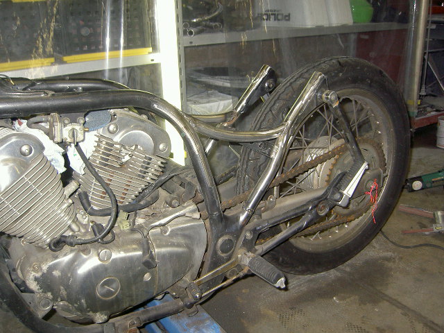 PICT2126.JPGみんなSRやXS650などでチョッパーを作っているので僕はSRVで作ってみます!!ビラーゴ250じゃありません!!チェーンドライブです、今日はリア周りを加工してみました、、サスの受けはレイダウンしていらない部分はカットしたほうがよさそうです、、この不人気車でかっっこいーーチョッパーを作って見せます!!