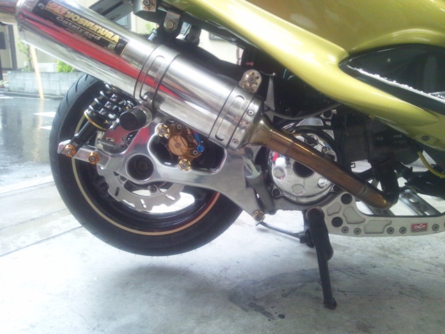 スイングアームは鏡面仕上げに、キャリパーはコイ目の金に塗り直し、、